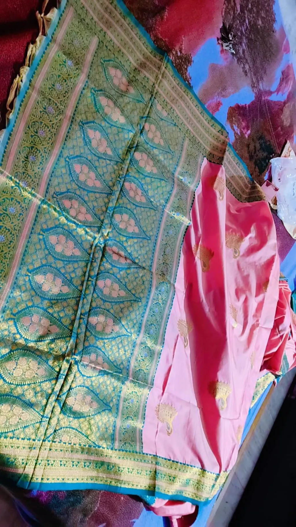 This elegant baby pink saree features a luxurious soft silk kanjivaram finish adorned with intricate teal and gold paisley motifs, making it a timeless addition to any wardrobe. The border is richly decorated with detailed patterns that blend traditional artistry with contemporary charm. Paired with a contrasting teal blouse, it exudes sophistication. Perfect for festive occasions or weddings.