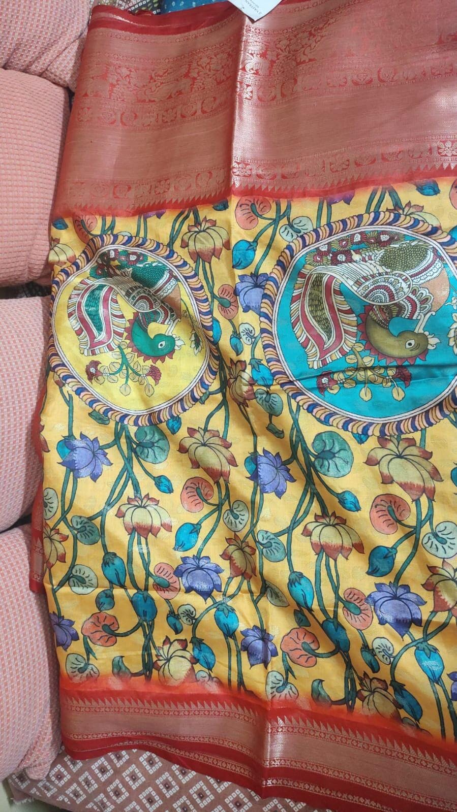 These sarees are made from high-quality silk and are known for their rich texture and vibrant colors.Kanjivaram sarees are characterized by their heavy zari work, intricate designs, and contrasting borders. Kalamkari is a traditional Indian art form that involves hand-painting or block-printing on fabric. The base of the saree is likely made from cotton or silk, depending on the type of saree.The zari border adds a touch of richness and elegance to the overall look.