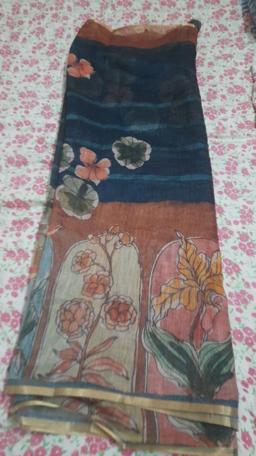 Woven in fine 60-count soft linen, this saree offers an airy, breathable drape ideal for all-day elegance. The body is adorned with free-hand flower block art, creating a graceful, artistic flow across the fabric. A refined golden zari patti border.perfect for summer occasions, office wear, and elegant day celebrations.
