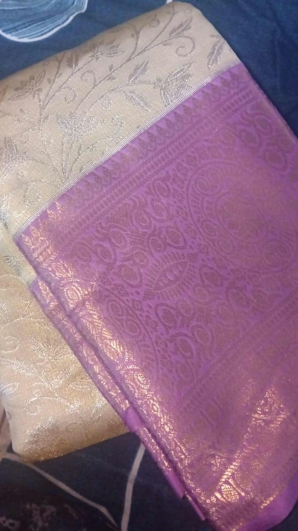 Grace redefined this stunning golden-beige Dharmavaram silk saree exudes understated luxury with its finely woven tonal floral zari patterns that shimmer gently under the light. The body speaks of quiet sophistication, while the saree bursts into festive vibrance with a contrasting magenta pink pallu and border, intricately crafted with opulent golden threadwork in traditional motifs.
