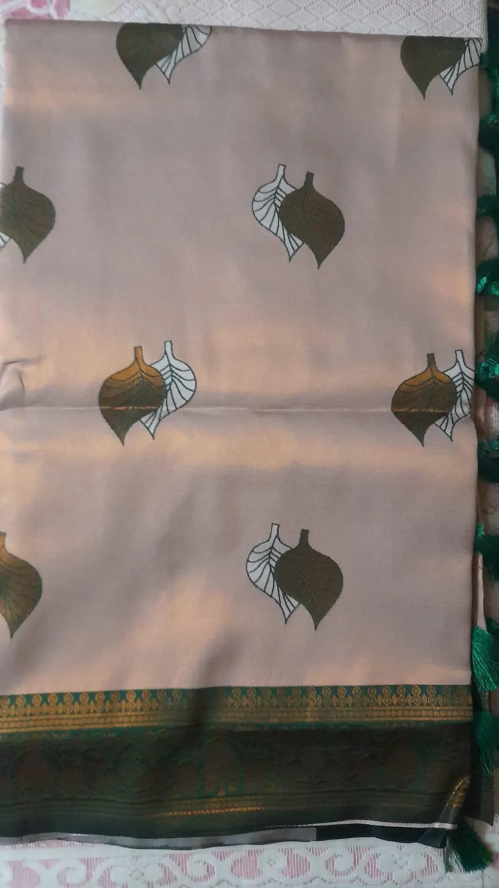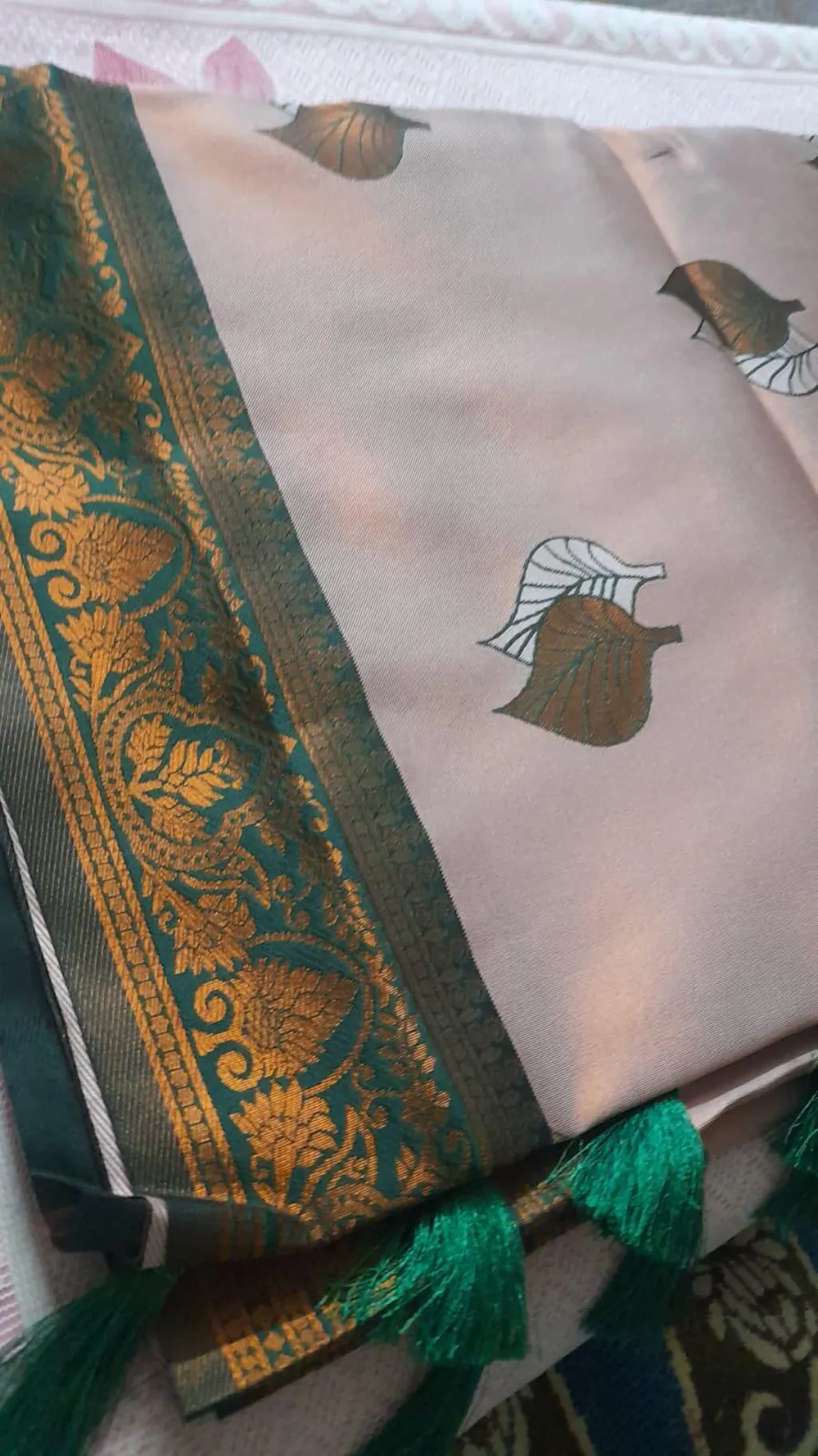 The saree is crafted from premium semi Kanjivaram tissue, known for its lightweight yet rich texture, offering a perfect drape and an opulent feel.The saree boasts a rich zari weaving pallu, adorned with elaborate and intricate motifs that enhance its grandeur. The pallu drapes elegantly, adding a striking visual appeal to your overall look making it perfect for special occasions and festivities.