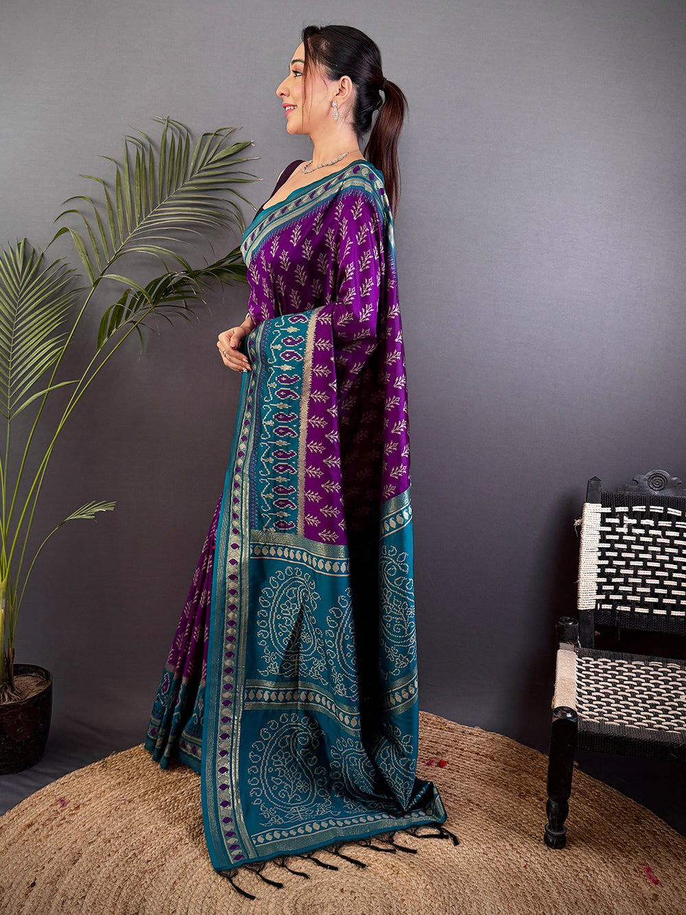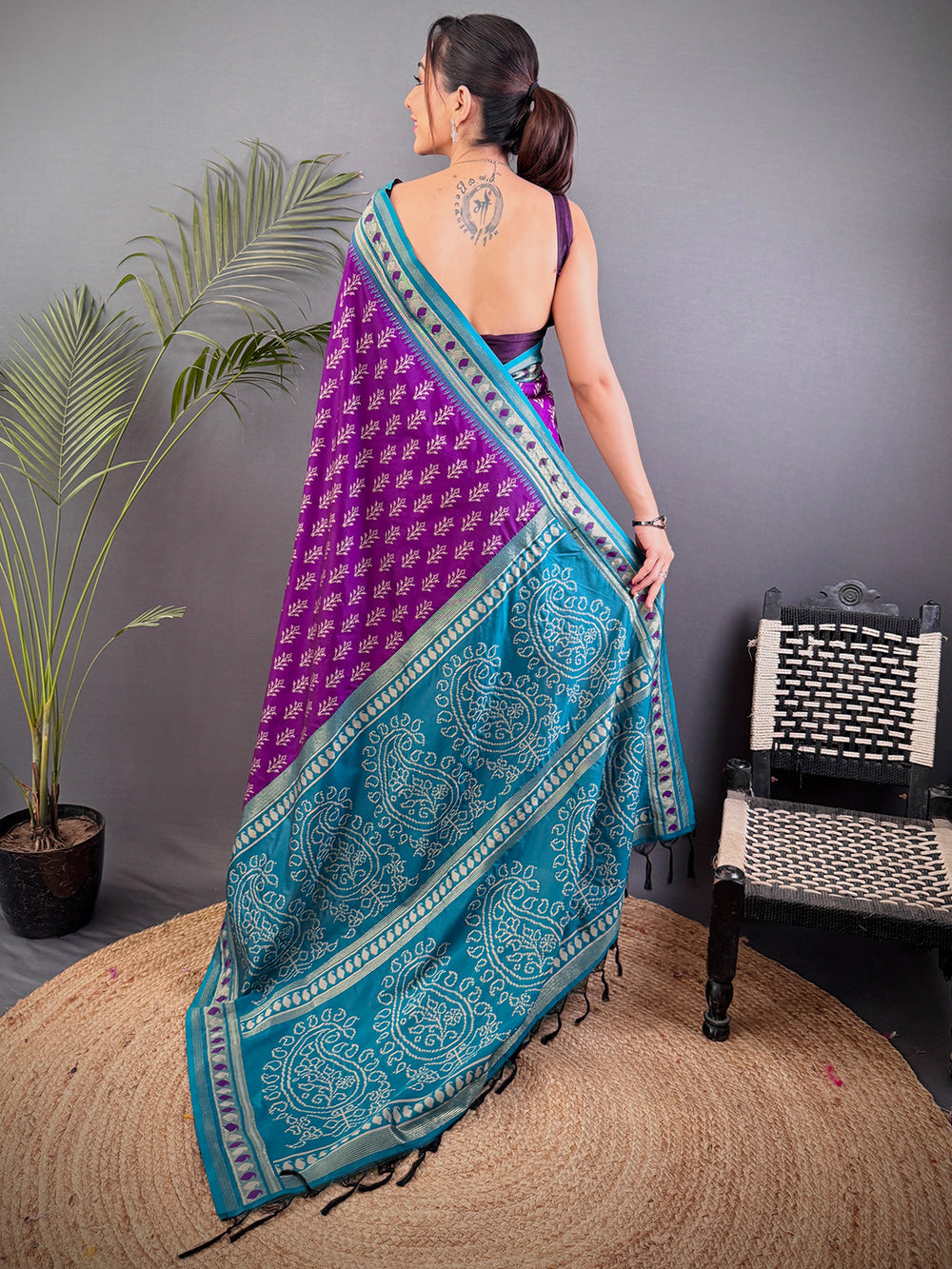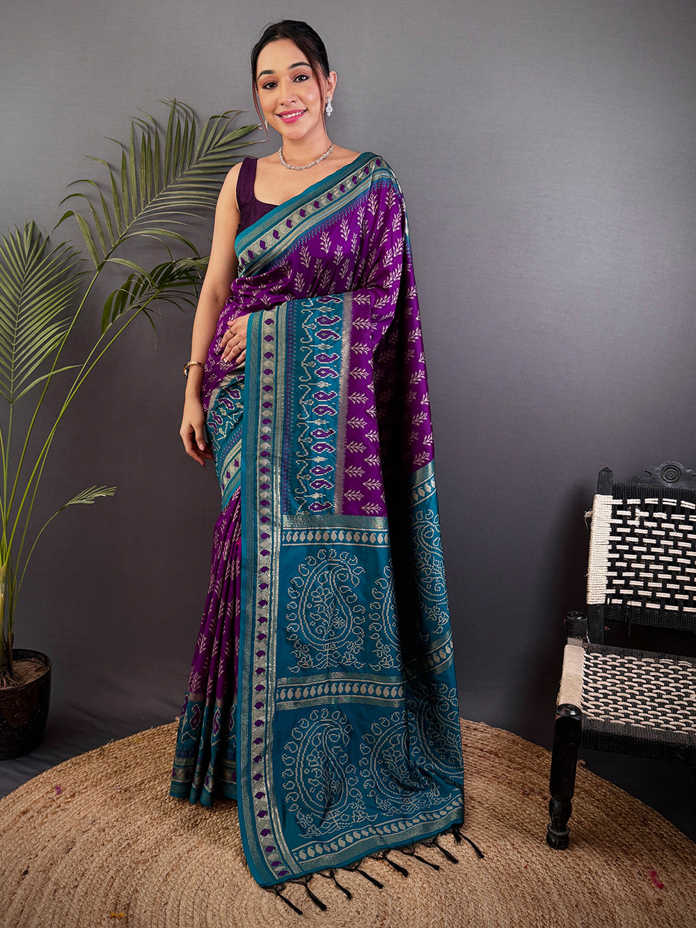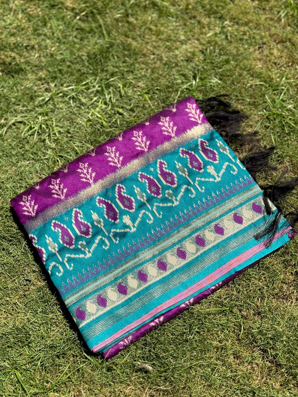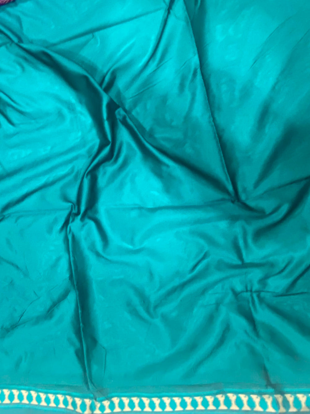 Step into elegance with this exquisite Wine & Rama Soft Silk Saree, a masterpiece of tradition and modern artistry. The deep Wine body is adorned with intricate silver zari motifs, exuding regal sophistication, while the contrasting rama Ikkat Weaving pallu showcases a mesmerizing geometric pattern, adding a contemporary charm.Luxuriously soft Silk With rama Gadhwal Border, Intricate Zari Work, Delicate Gold detailing for a royal touch.Perfect for weddings, festive celebrations, or an elegant evening affair, this saree is a must-have statement piece for every saree connoisseur.