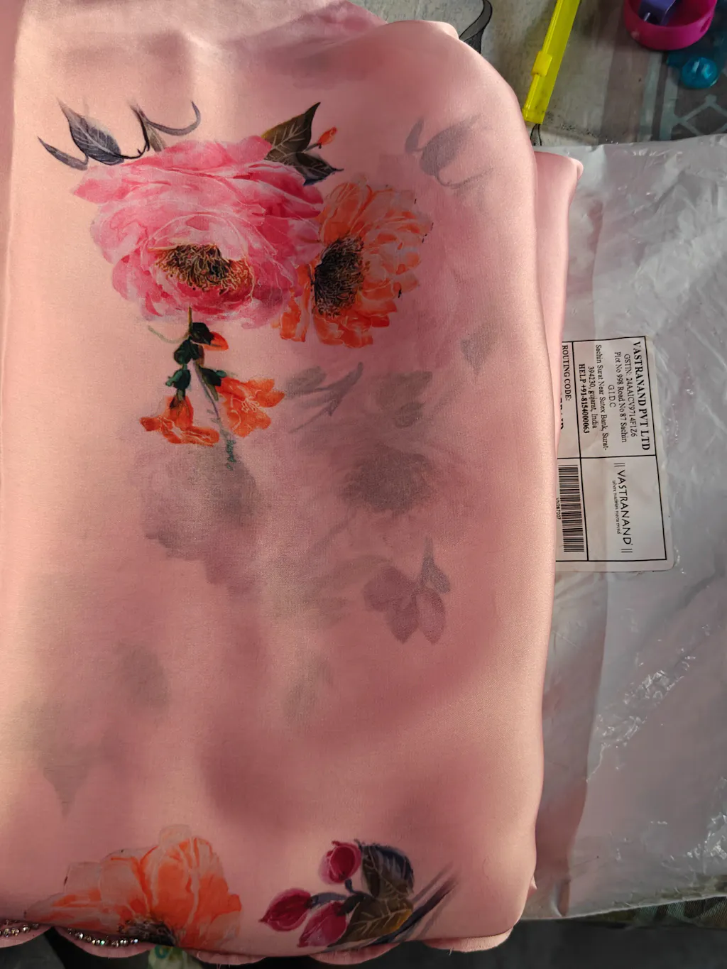 Elegance with our stunning Pure Satin Georgette fabric, graced with intricate floral prints and embellished with a radiant Zircon Swarovski work border. This fabric exudes charm and sophistication, with its smooth texture and delicate drape, creating a canvas that is both luxurious and captivating. The floral prints add a touch of feminine grace, while the shimmering Swarovski zircon border lends an air of opulence and glamour.