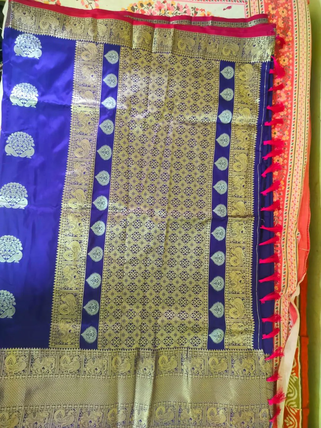 Elevate your style with this stunning Pure Banarasi Katan Silk saree. Made with soft Banarasi silk fabric, it features a luxurious Zari Flower Vely and intricate design, adding an elegant touch to your look. Perfect for everyday or casual occasions, this saree also comes with a Contrast-matching blouse piece for added convenience.