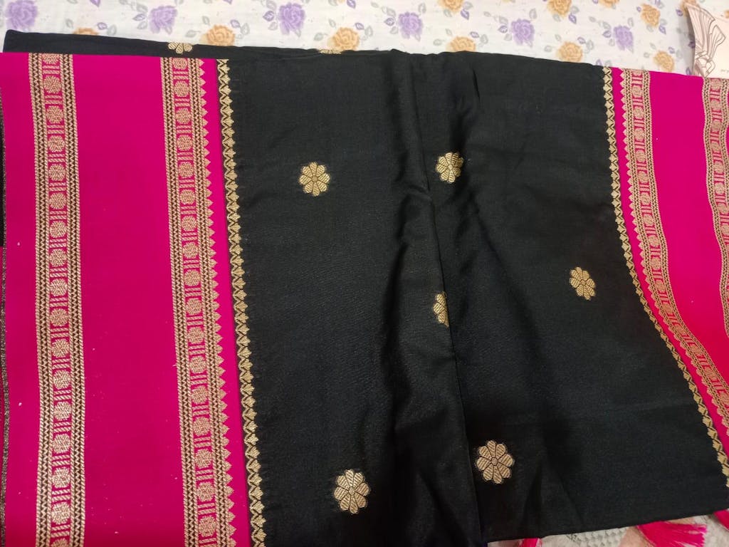 This stunning Black Soft Silk Saree, beautifully adorned with delicate floral buttas scattered across the body.The smooth black base creates a bold yet graceful canvas, intricate gold zari weaving adds a rich traditional touch. perfect for both festive occasions and graceful evening gatherings.