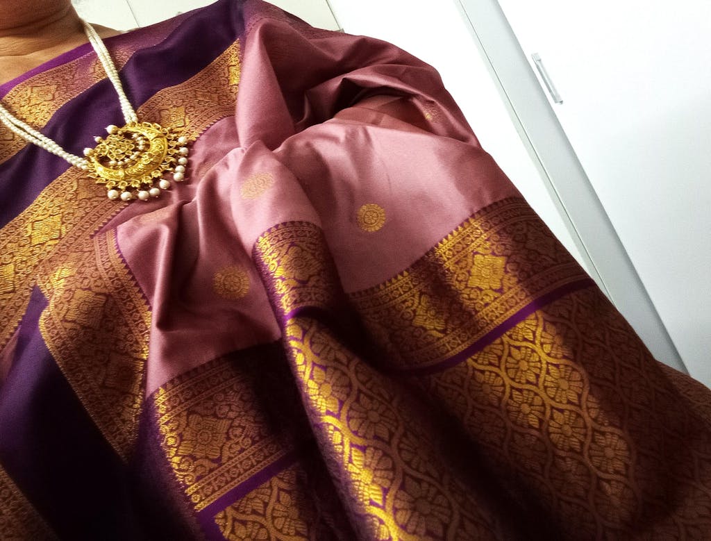 This soft silk saree features a unique onion-toned base that exudes subtle elegance and refined charm. The look is elevated with a dark contrast Gadwal border, adding depth and traditional richness to the drape. Finished with an exclusive rich pallu in soft silk, the saree beautifully blends classic Gadwal aesthetics with contemporary colour sensibility.perfect for festive occasions, cultural celebrations, and elegant traditional wear.