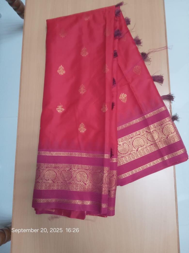 Elevate your ethnic elegance with this exquisite soft silk saree, adorned with a luxurious double satin Bentex finish that lends a subtle sheen and rich texture. The saree is gracefully complemented by a traditional Gadwal border, showcasing intricate craftsmanship that speaks of heritage charm. The highlight of this ensemble is the royal rich pallu, woven with finesse to exude opulence and grace. Perfect for festive occasions, weddings, or grand celebrations.