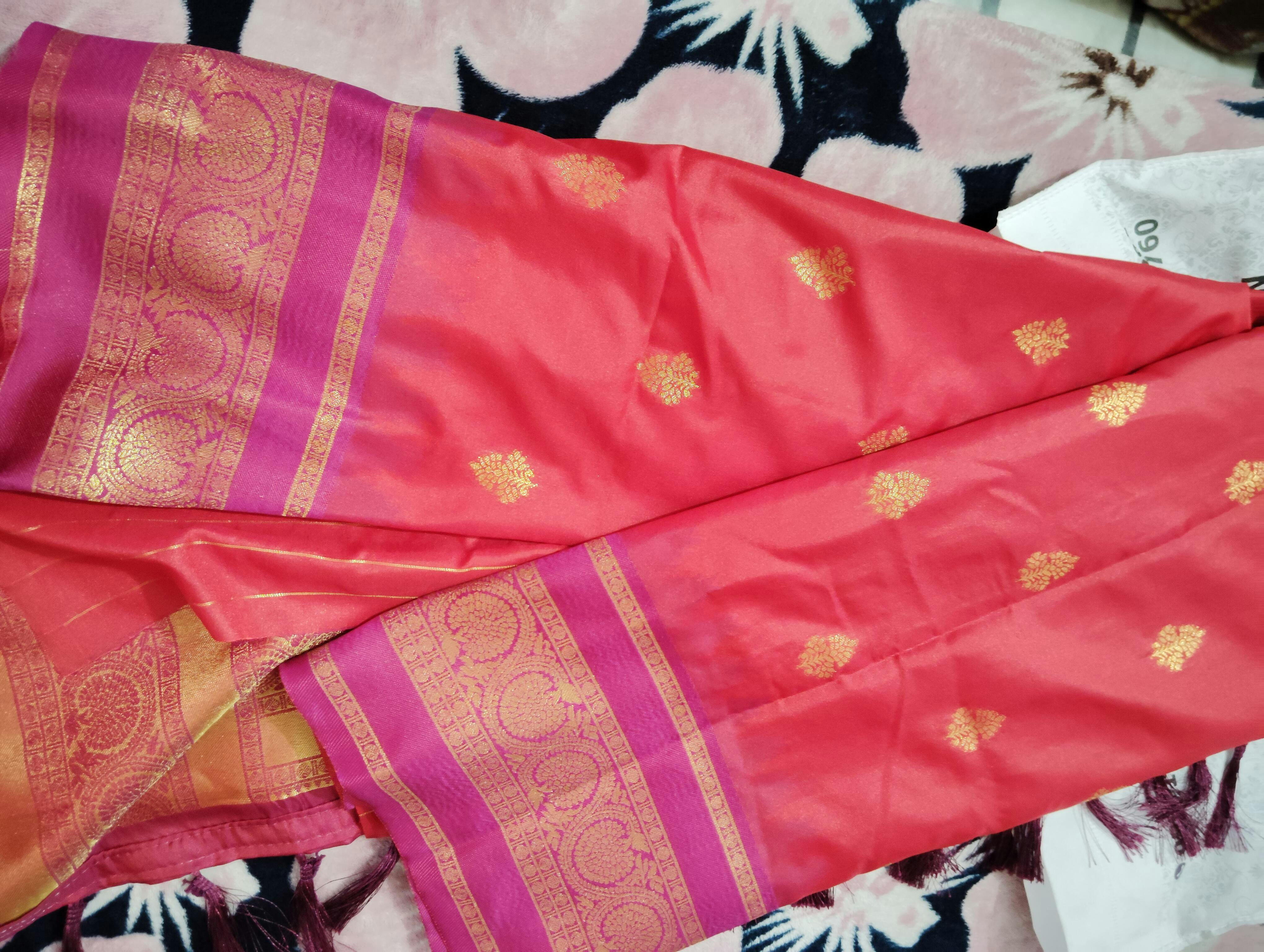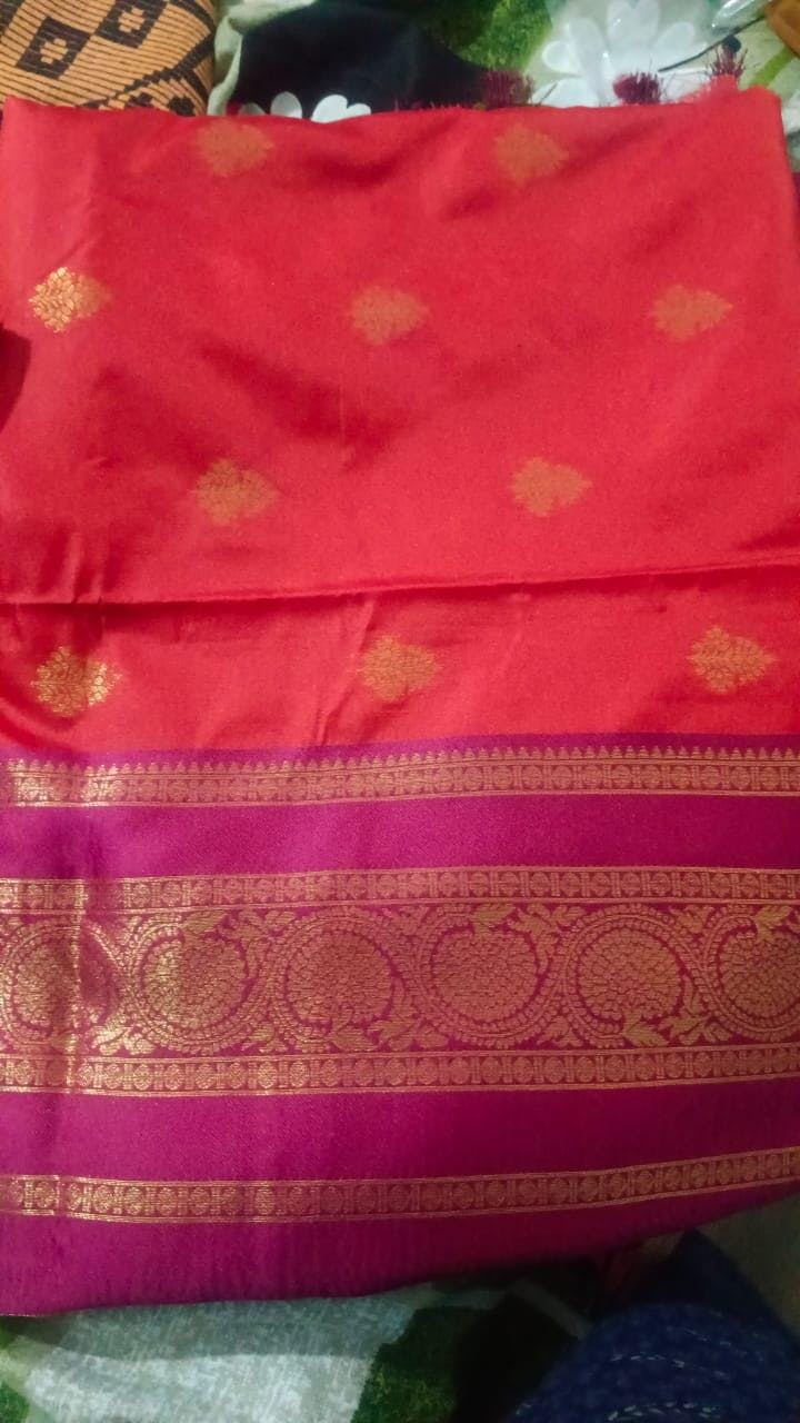 Elevate your ethnic elegance with this exquisite soft silk saree, adorned with a luxurious double satin Bentex finish that lends a subtle sheen and rich texture. The saree is gracefully complemented by a traditional Gadwal border, showcasing intricate craftsmanship that speaks of heritage charm. The highlight of this ensemble is the royal rich pallu, woven with finesse to exude opulence and grace. Perfect for festive occasions, weddings, or grand celebrations.