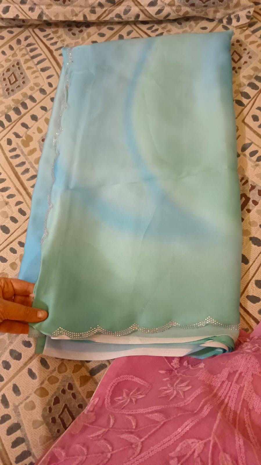 Exclusive Pure Satin Georgette Ombre Print saree, adorned with delicate Swarovski stone work. The luxurious satin georgette fabric drapes effortlessly, exuding a sense of sophistication and grace with every movement. Each Swarovski stone is intricately placed, adding a touch of opulence and glamour to the saree. Perfect for Party Wear, traditional occasions, or modern events.