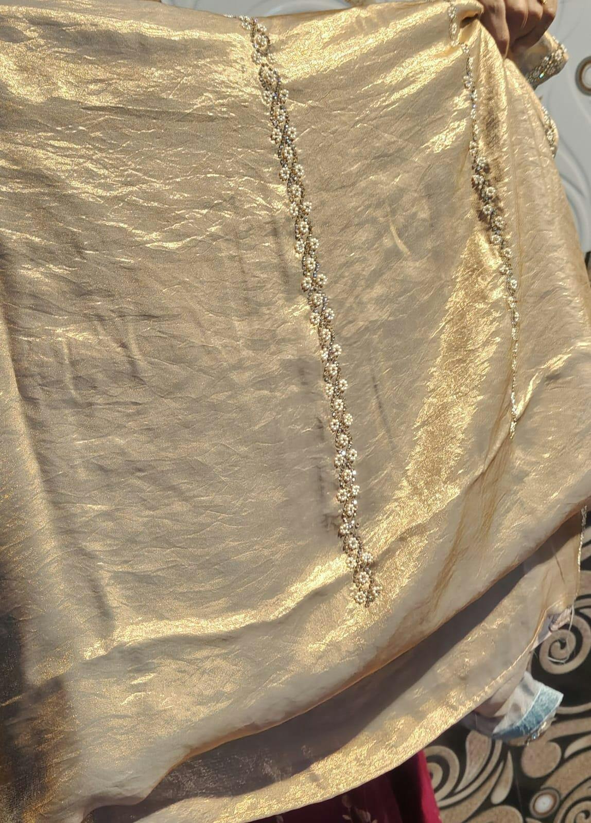 Crafted in luxurious satin tissue fabric, this exclusive party saree is embellished with shimmering Swarovski accents and delicate pearl work. The luminous texture and refined hand detailing create a glamorous yet graceful look—perfect for evening parties, receptions, and statement celebrations.